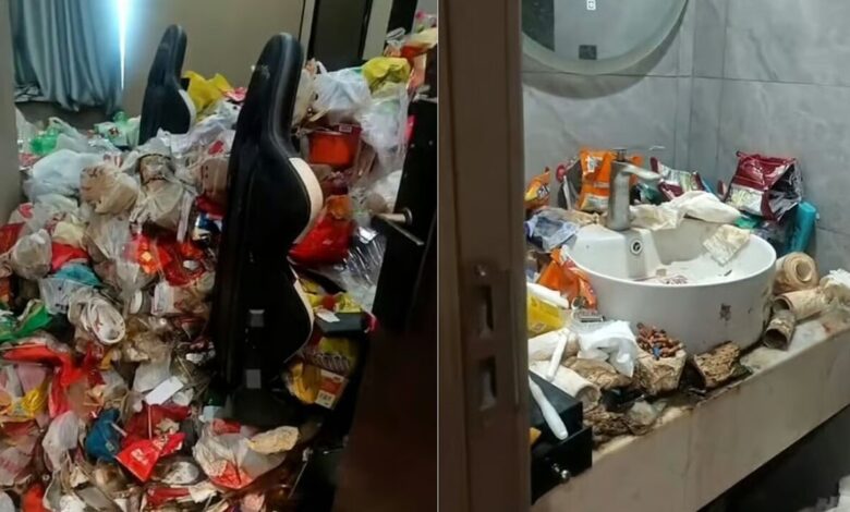 کارکنان هتل پس از خروج این مهمان قدیمی با صحنهای بسیار عجیب روبهرو شدند. اتاق پر از زبالههایی چون دستمال توالت، بطریهای پلاستیکی، بستههای خالی فستفود و انواع قوطیهای کنسرو و دستمال کاغذی بود.